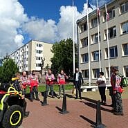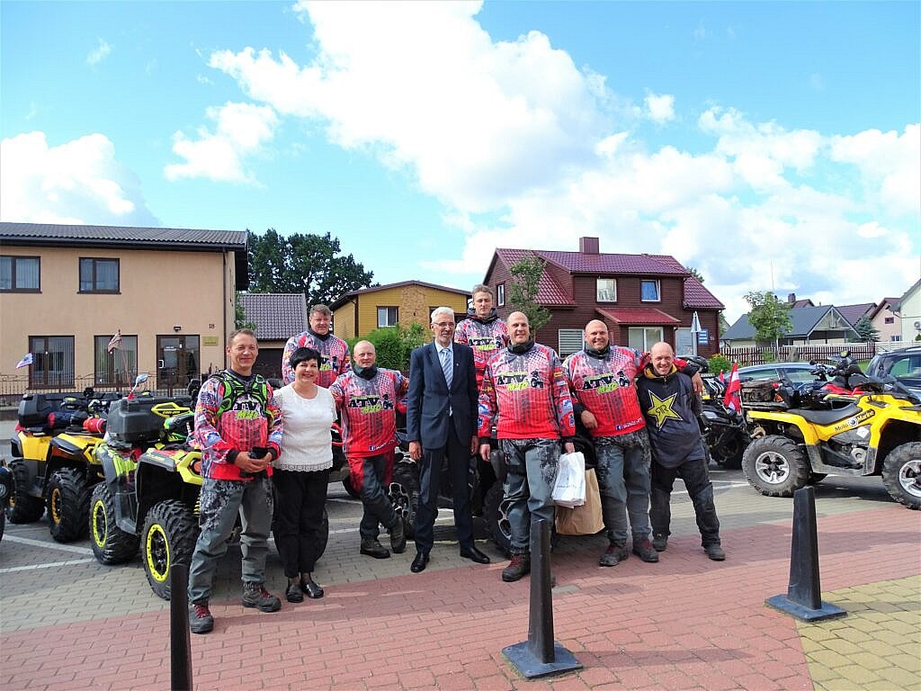 Prie Skuodo rajono savivaldybės Savivaldybės meras Petras Pušinskas ir Savivaldybės mero pavaduotoja Daiva Budrienė pasitiko keturratininkus, domėjosi kelionės maršrutu, tikslais ir linkėjo sėkmingos, saugios, turiningos bei įdomios išvykos.