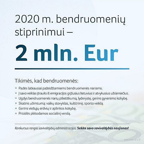 Savivaldybių organizuojamiems vietinių bendruomenių, nevyriausybinių organizacijų ir religinių bendruomenių konkursams Socialinės apsaugos ir darbo ministerija šiais metais skyrė 2 mln. eurų.