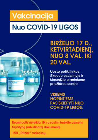 Pasiskiepyti galite Uosto poliklinikos Skuodo padalinyje ir Mosėdžio pirminiame priežiūros centre birželio 17 d., ketvirtadienį, nuo 8 val. iki 20 val.