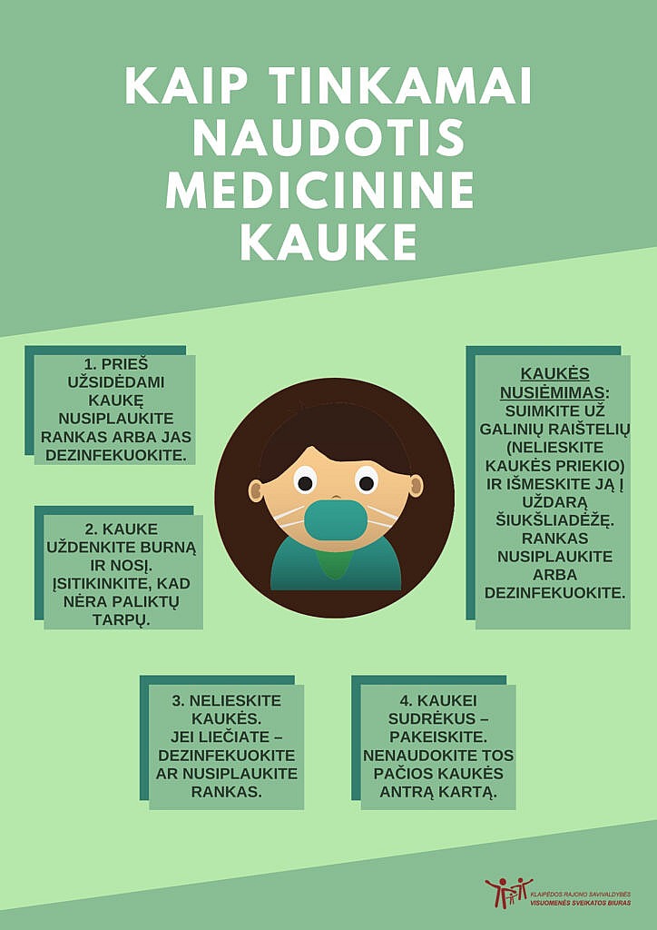 3. Nelieskite kaukės, jei liečiate dezinfekuokite ar nusiplaukite rankas.