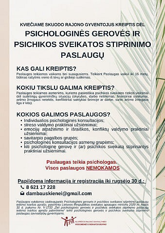 Kviečiama kreiptis dėl psichologinės gerovės ir psichikos sveikatos stiprinimo paslaugų