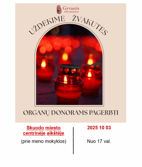 Spalis – organų donorystės mėnuo. Šia proga kviečiame visus susitelkti ir spalio 3 d. 17 val. Skuodo miesto centrinėje aikštėje uždegti žvakutes už tuos, kurie dovanojo gyvybę kitiems.