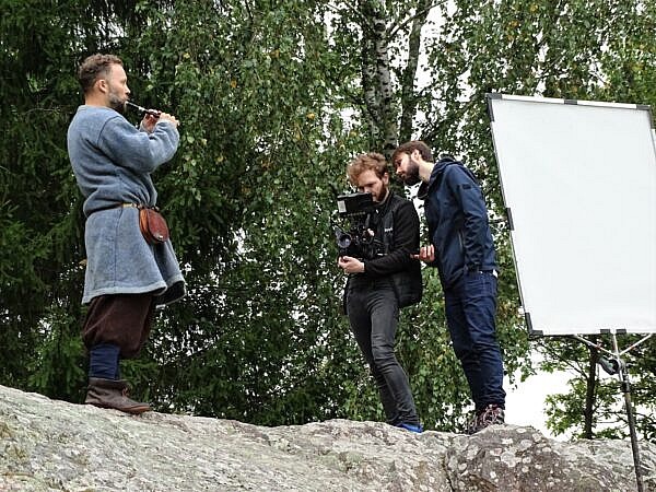 Ant didžiausio Lietuvoje Barstyčių akmens filmuojamas multiinstrumentalistas, kraštietis Saulius Petreikis.