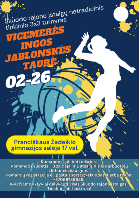 Vasario 26 d. 17.00 val. Skuodo P. Žadeikio gimnazijos (Vytauto g. 14, Skuodas) sporto salėje vyks rajono įstaigų netradicinio tinklinio 3×3 turnyras „Vicemerės Ingos Jablonskės taurė“.
