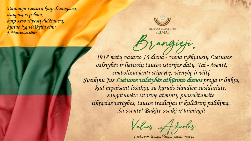 Seimo narys Valius Ąžuolas sveikina su Vasario 16-ąja