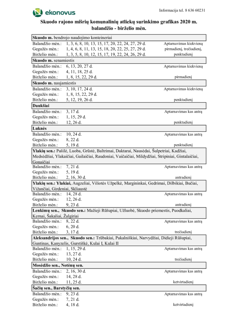 Skuodo rajono mišrių komunalinių atliekų surinkimo grafikas 2020 m. balandžio–birželio mėn.